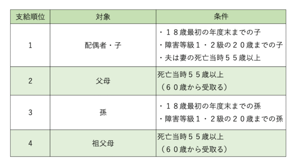 父母・孫・祖父母は先順位者がいる場合、遺族年金を受け取れません。