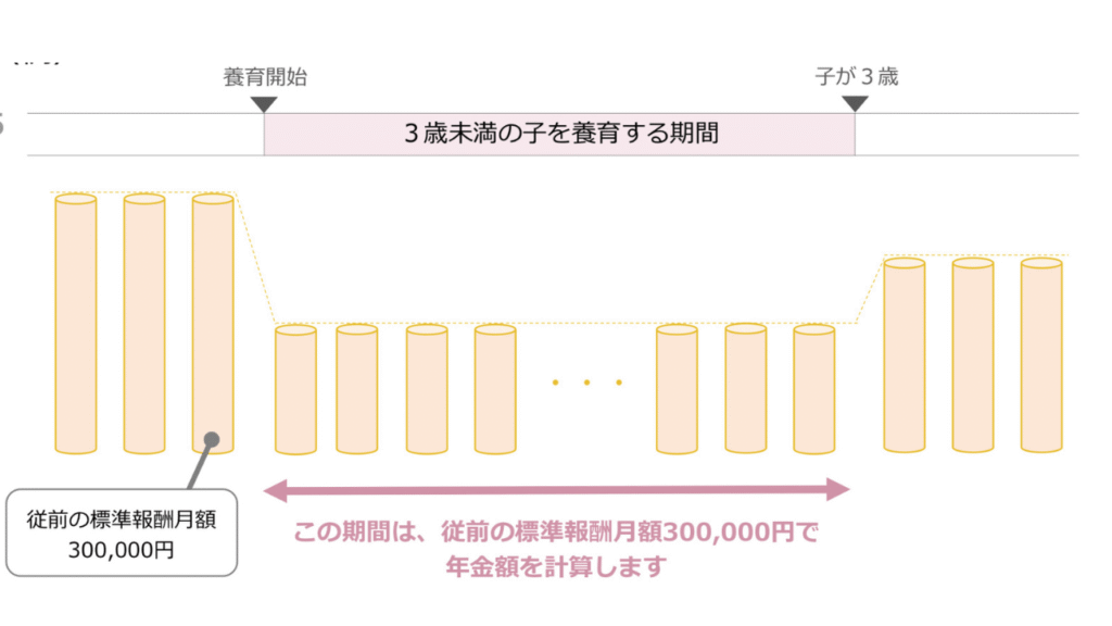 3歳未満の子どもを養育している間に、時短勤務や働き方の変更で収入が下がったとしても、実際の低い給与額ではなく、養育前の標準報酬月額で年金の記録を計算してくれる制度です。