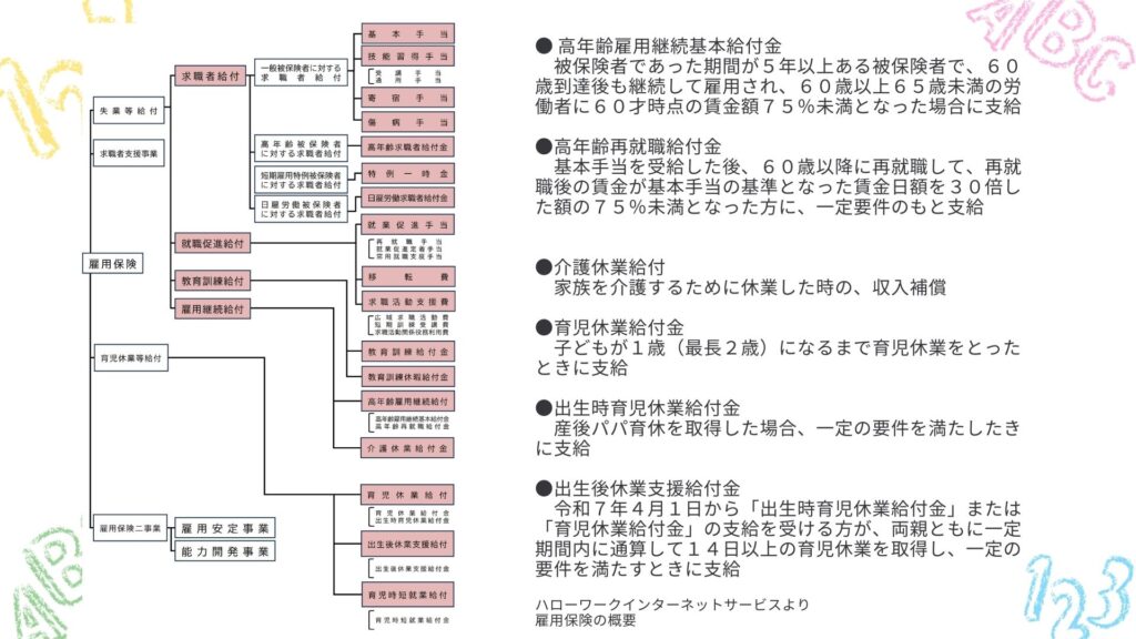 雇用保険とは、働いている「労働者」が働けなくなった時や求職活動の支援、育児・介護を行う人をサポートするための制度です。主に次のような給付制度があります。
