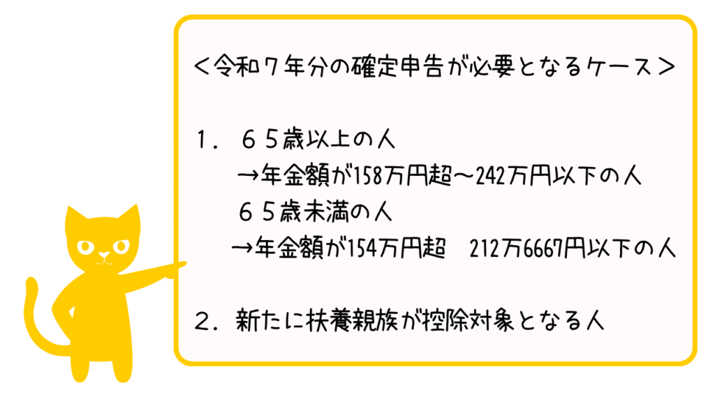 一方、65歳以上で年金額が242万円を超える人、65歳未満で年金額が213万円を超える人で、基礎控除以外の控除がない場合は、改めて確定申告をする必要はありません。